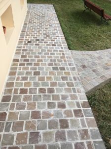 Notre client souhaitait paver le tour de son habitation ainsi que l’allée d’accès. Nous avons proposé un pavé de grès aux couleurs panachées s’harmonisant avec l’enduit de la façade. Le choix d’une pose en quinconce formant un tapis à qui courre le long de la maison donne un joli cachet à l’ensemble !