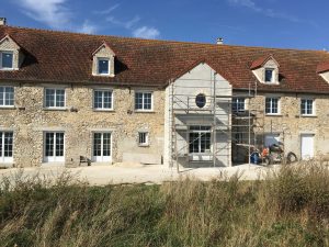 Dans cette grange en cours de restauration, nous avons déjà réalisé tout un ensemble de travaux qui font appel à toutes nos compétences. Ainsi, nous avons remplacé les menuiseries et créé les lucarnes. Ensuite, nous venons de créer une extension de l’entrée et réaliser des modénatures sur la façade (façon de pierres apparentes). Puis, l’intérieur a été complètement modifié et les pièces redistribuées. Enfin, nous avons procédé à toute l’isolation intérieure du bâtiment.